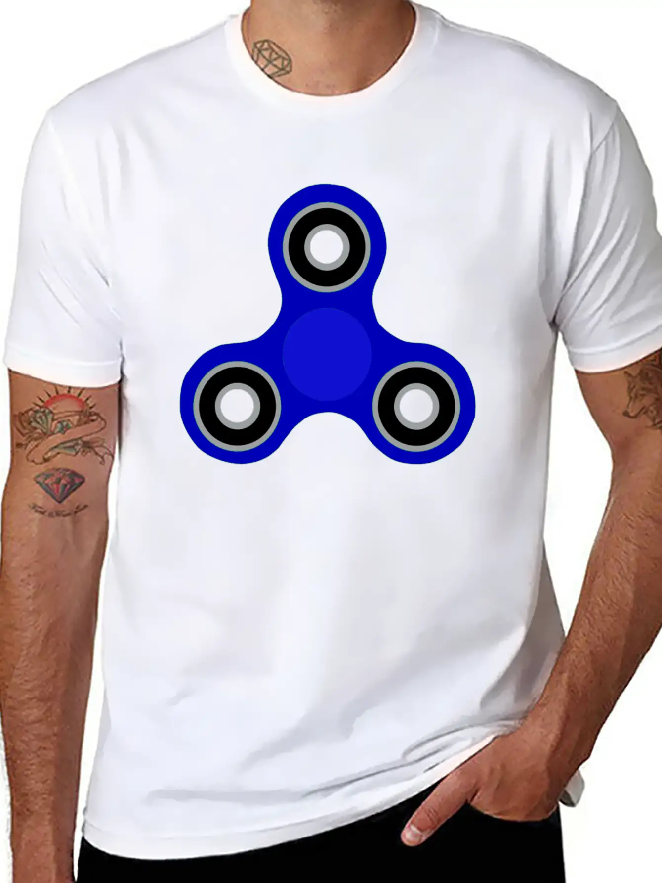 This shirt showcases the Blue Fidget Spinner in a sleek and subtle way. A must-have for fans of timeless design. Pure cotton feel.