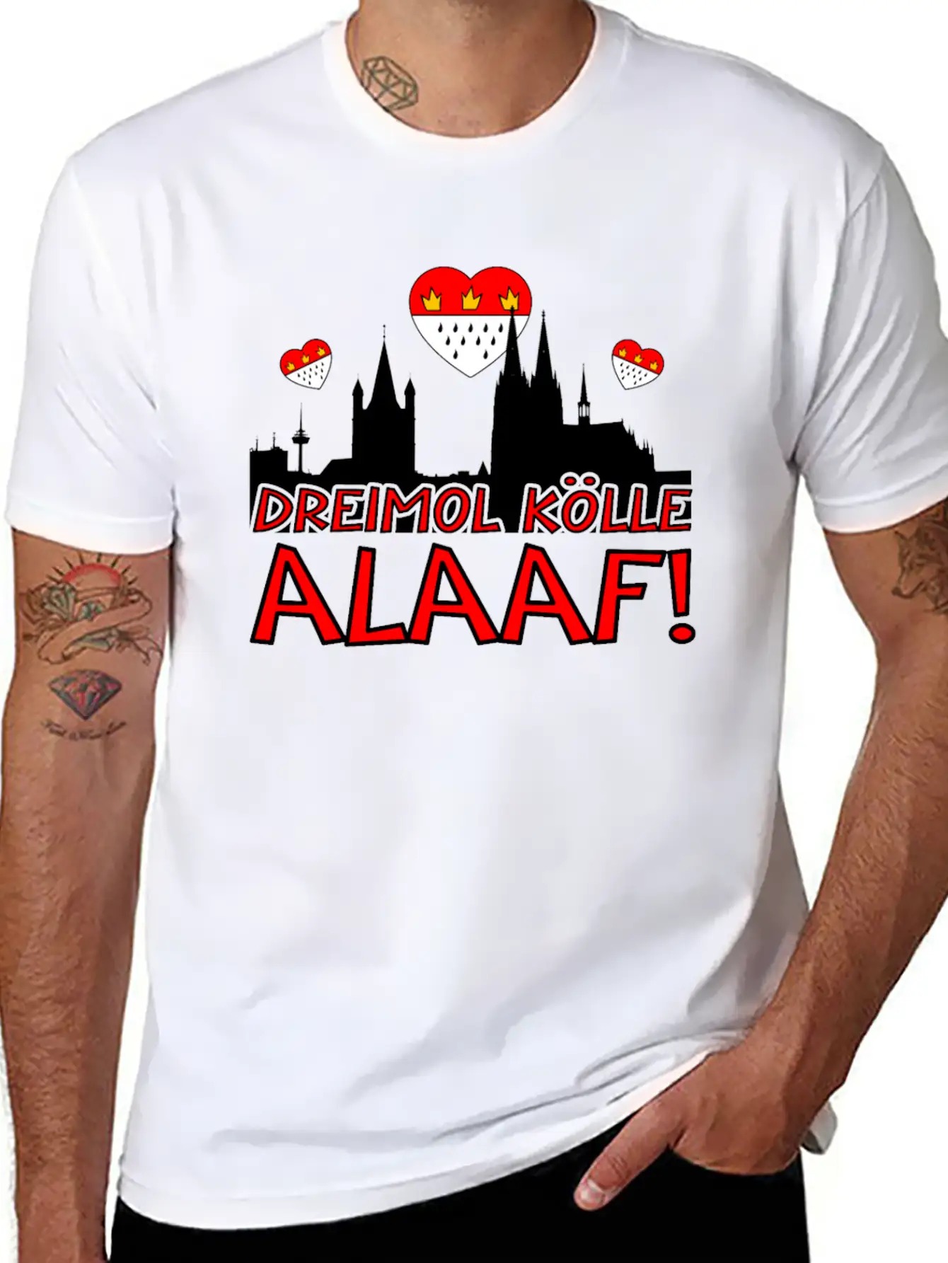 This T-shirt features a clean and artistic depiction of the Carnival costume Dreimol Kölle Alaaf Herz Cologne, perfect for everyday casual wear. Soft, breathable cotton.