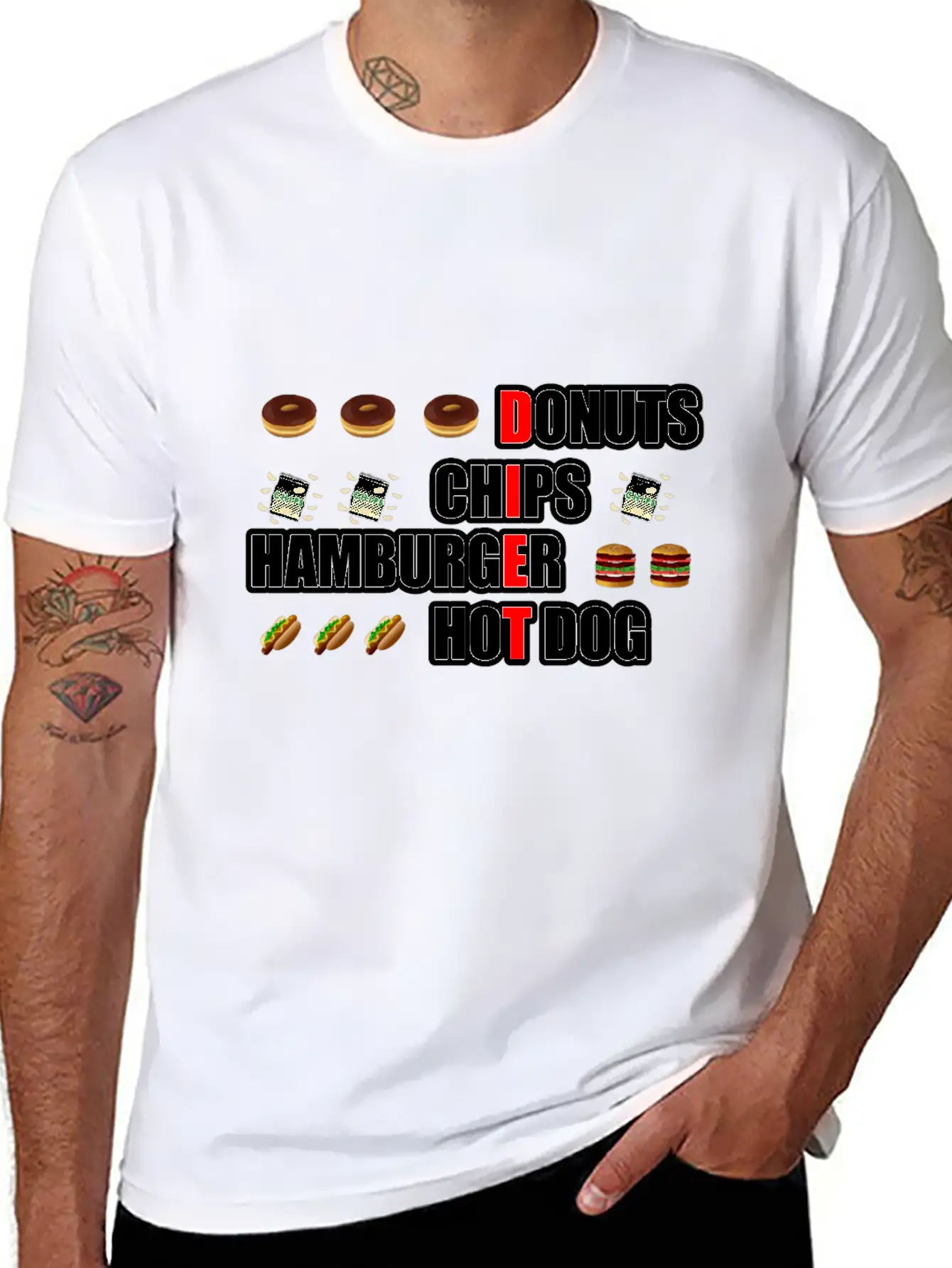 The diet with junk food is the centerpiece of this comfy tee, combining a classic cut with modern design.