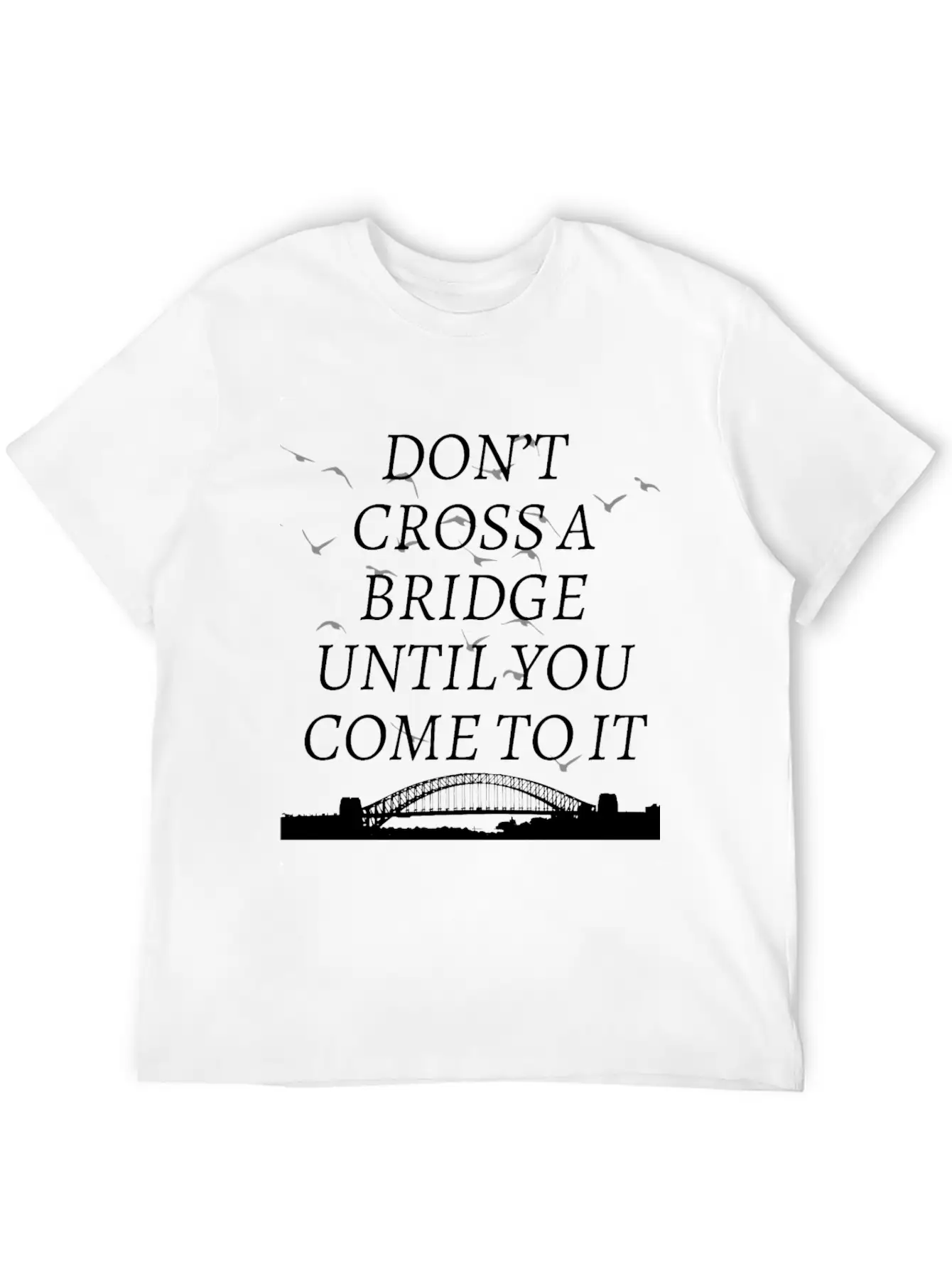 A modern tee with a standout Don’t cross a bridge until you come to it graphic – ideal for relaxed days or casual outings. Smooth and lightweight fabric.