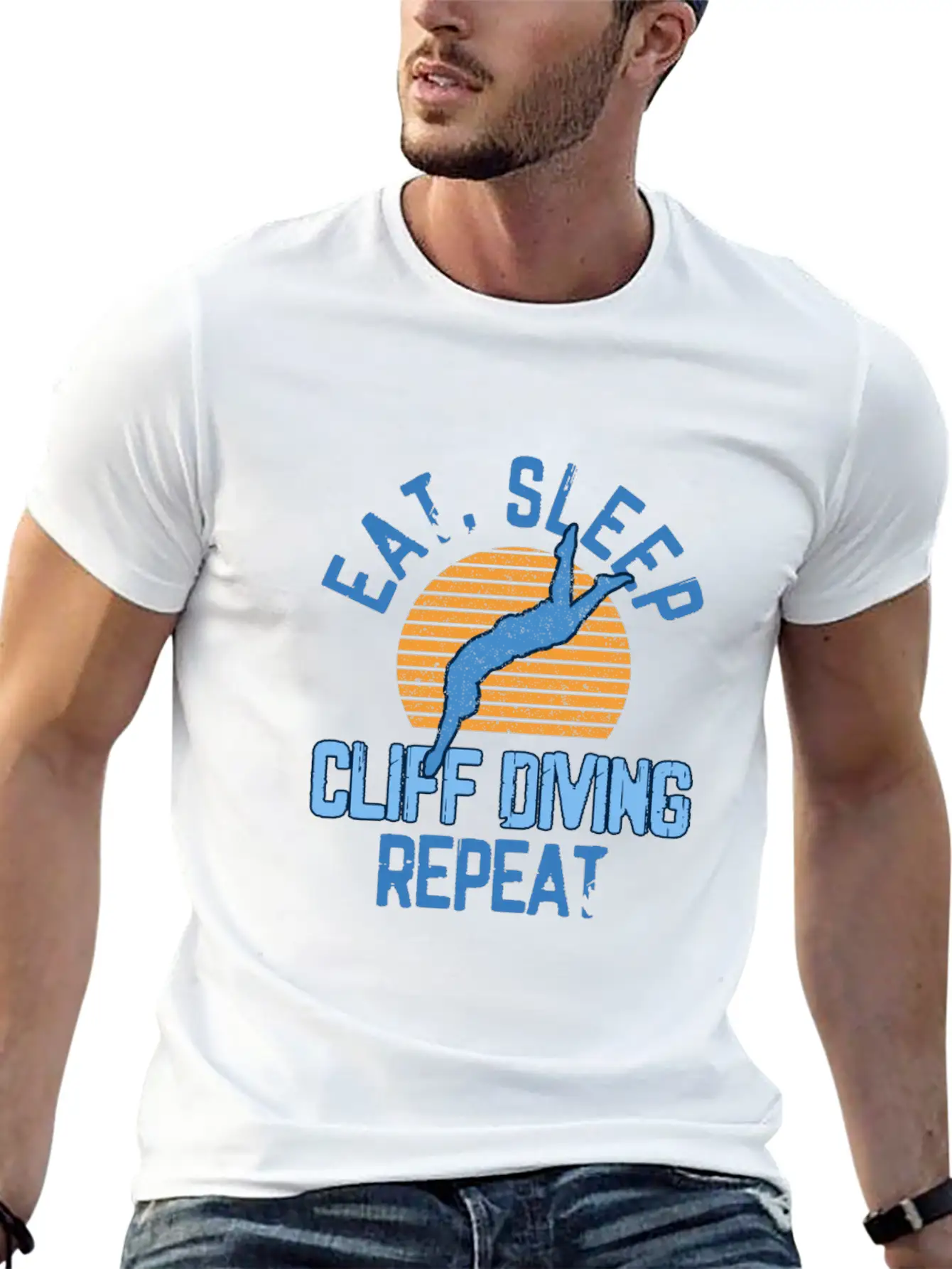 Designed with a bold yet minimal Eat Sleep Cliff Jumping Cliff Diving Extreme print, this tee brings subtle personality to your wardrobe. Lightweight and comfortable.