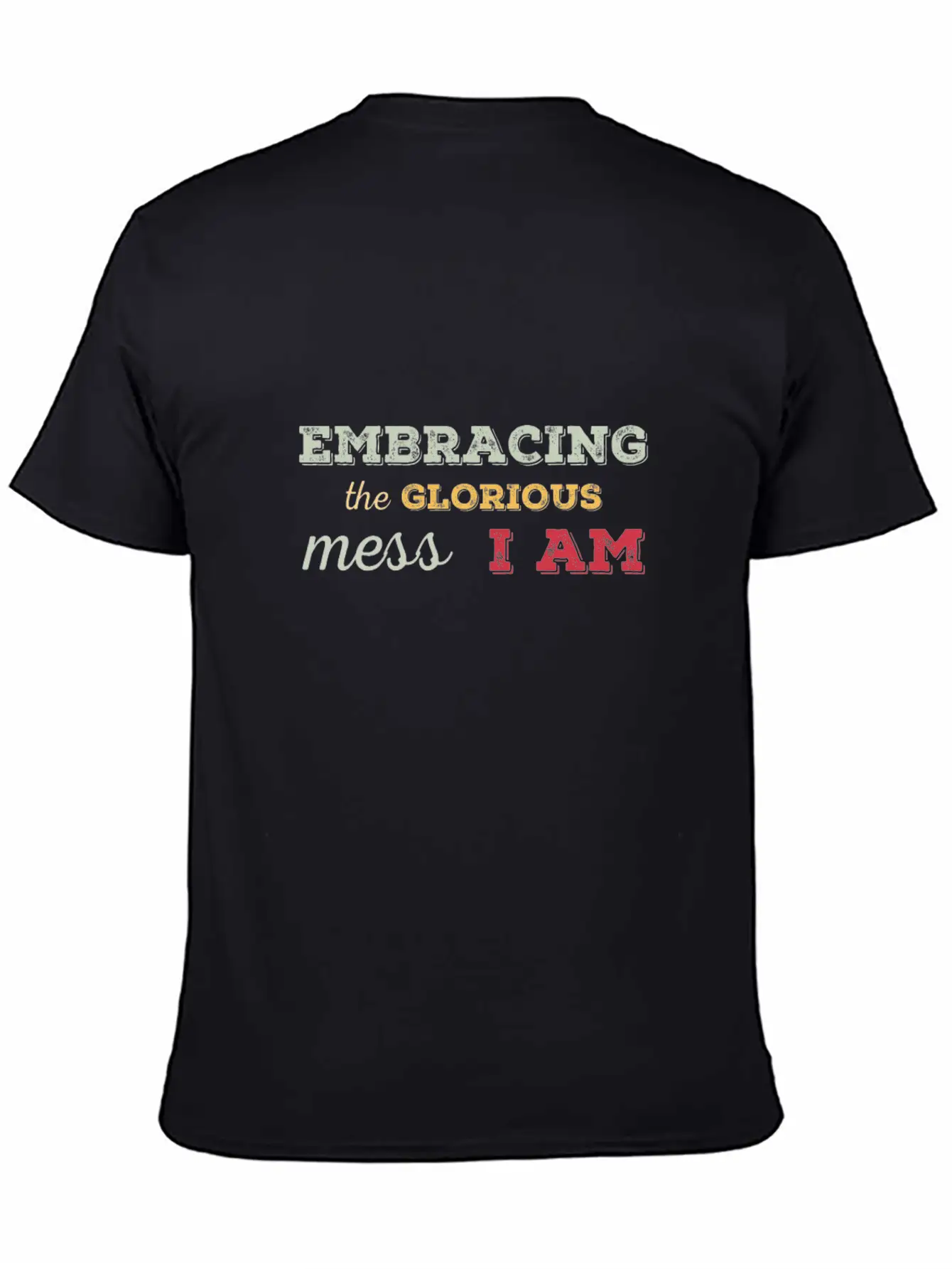 Simple, stylish, and themed with the Embracing The Glorious Mess I Am - Anxiety Quotes, this T-shirt is perfect for adding personality to your outfit. Soft cotton touch.