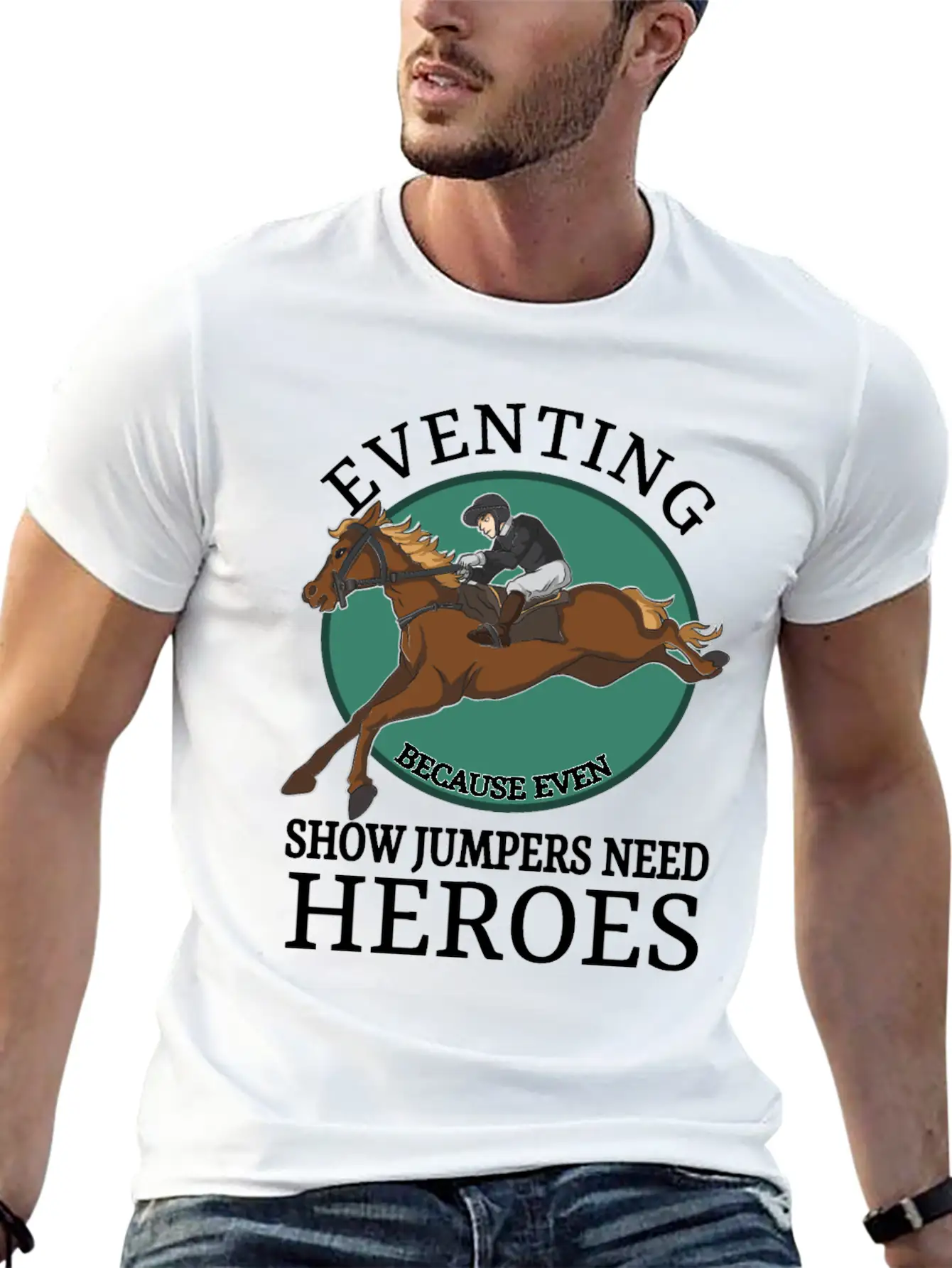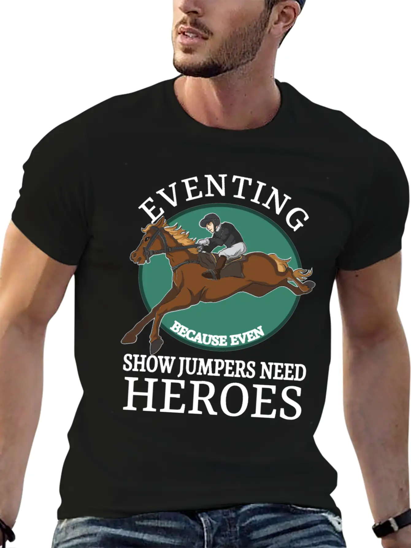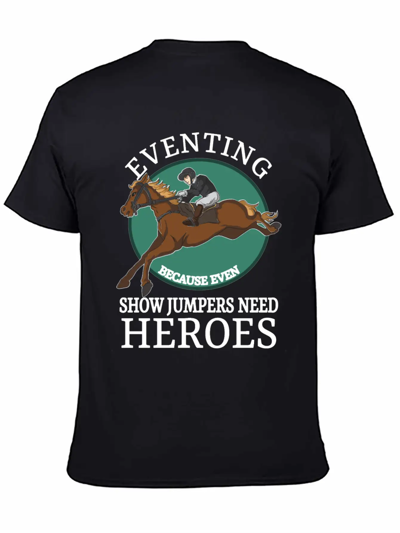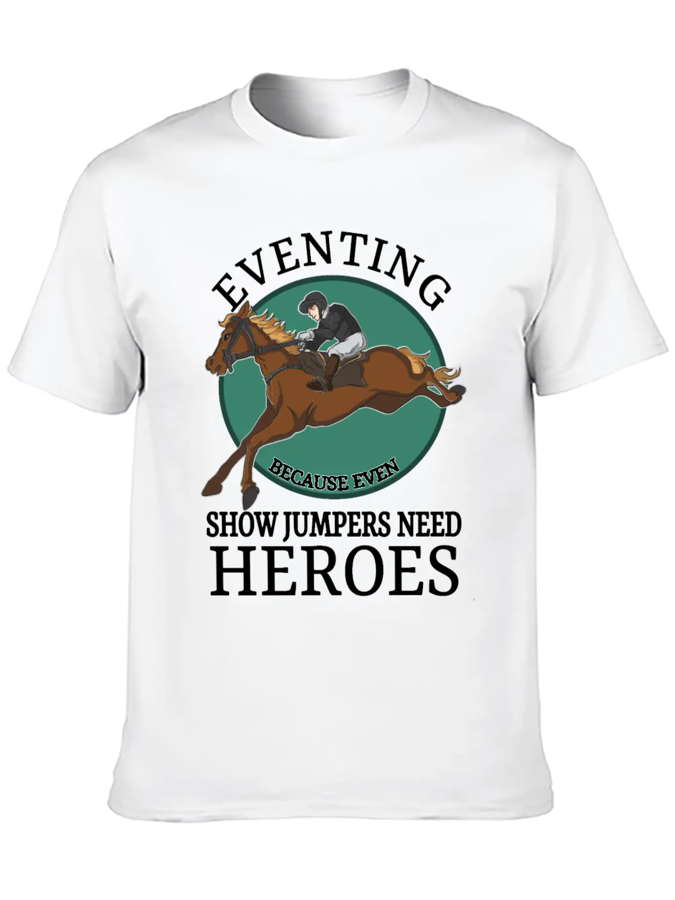 The Eventing Because Even Show Jumpers Need Heroes is the centerpiece of this comfy tee, combining a classic cut with modern design.
