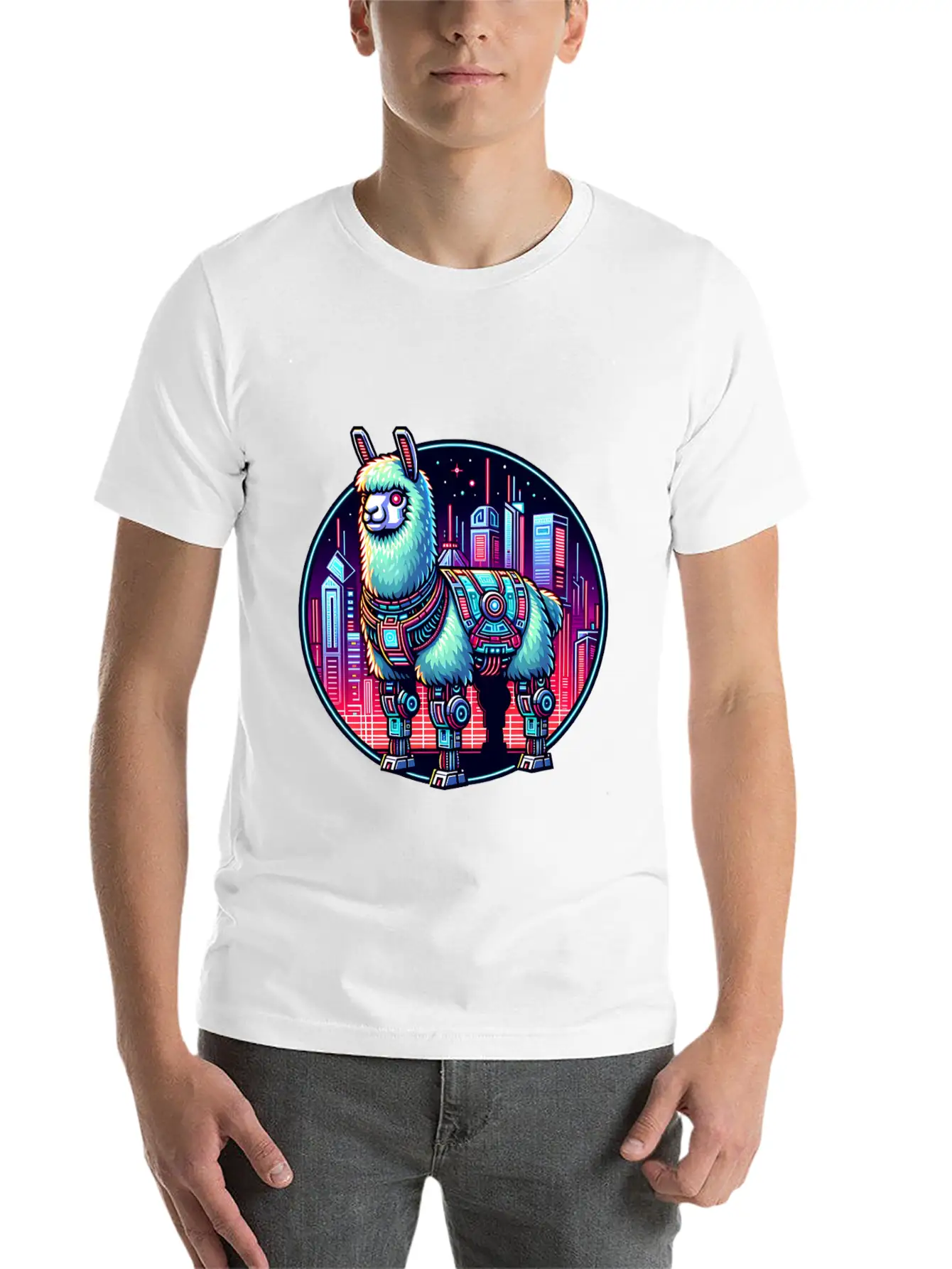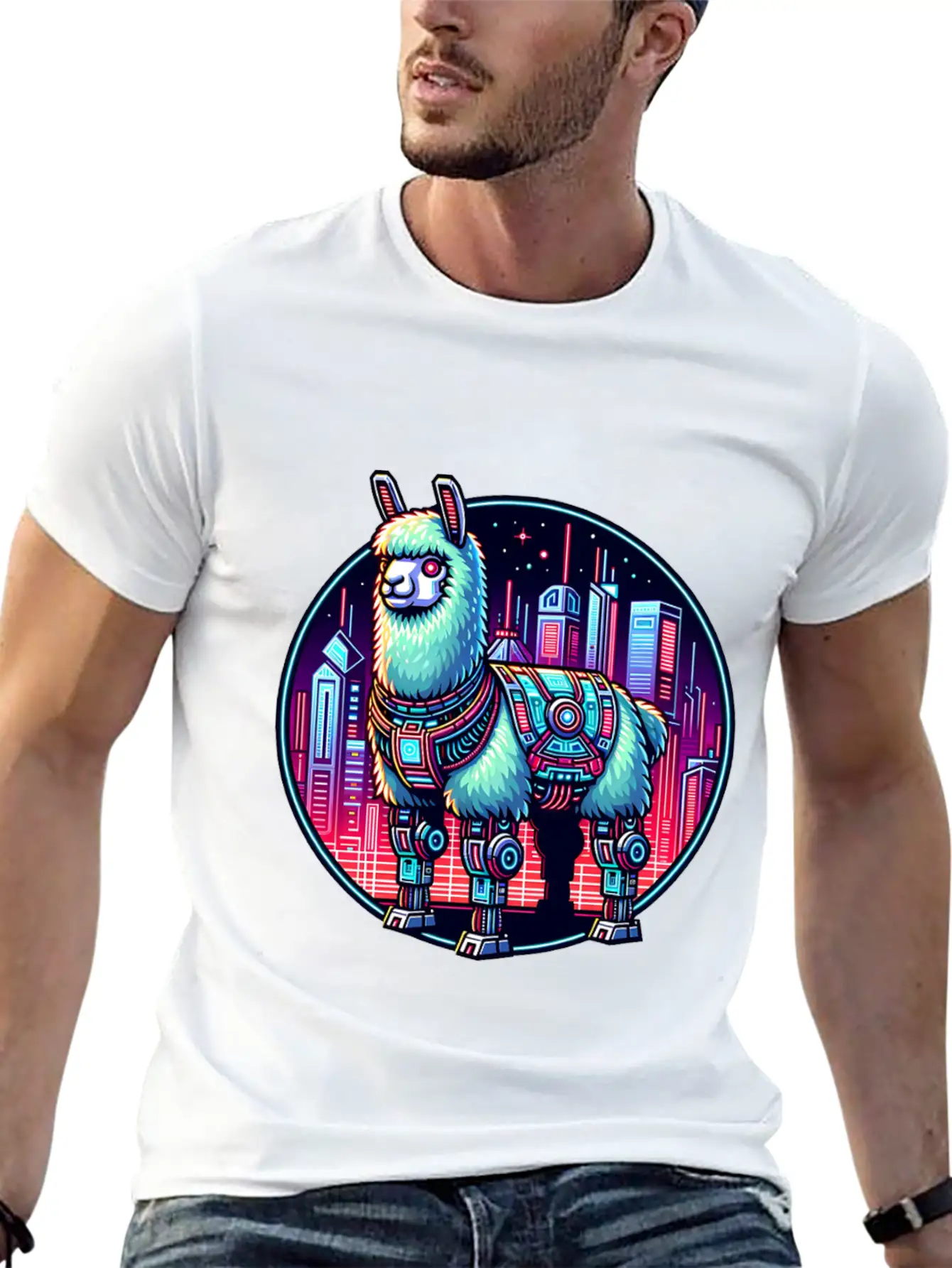 The Futuristic Cyberpunk Llama in Neon Cityscape is the centerpiece of this comfy tee, combining a classic cut with modern design.