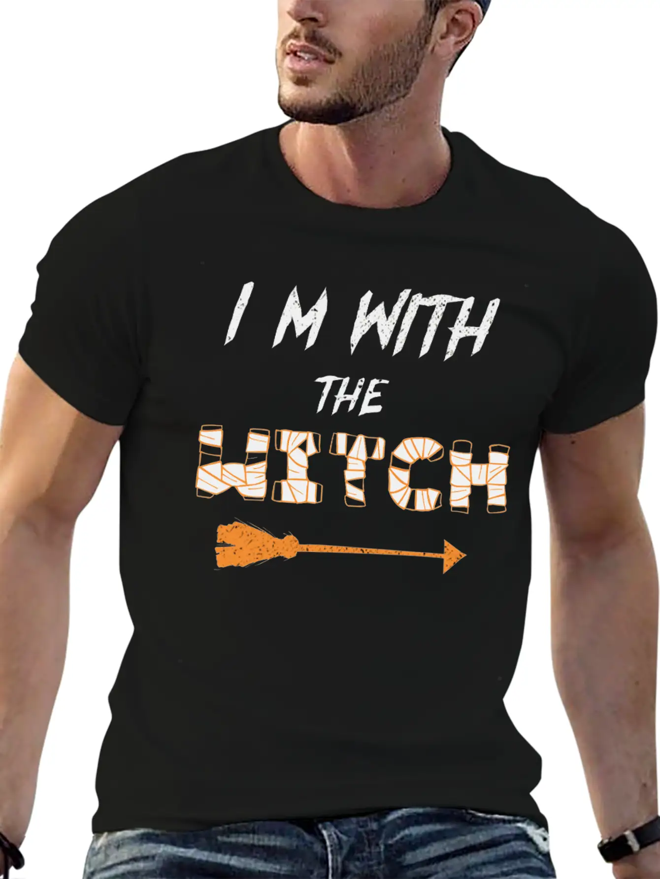 This T-shirt features a clean and artistic depiction of the I'm With The Witch Halloween Fun, perfect for everyday casual wear. Soft, breathable cotton.
