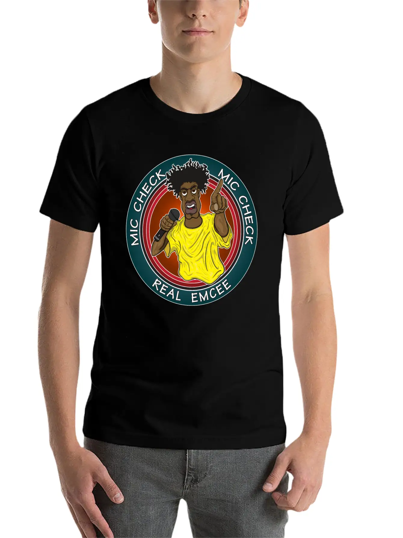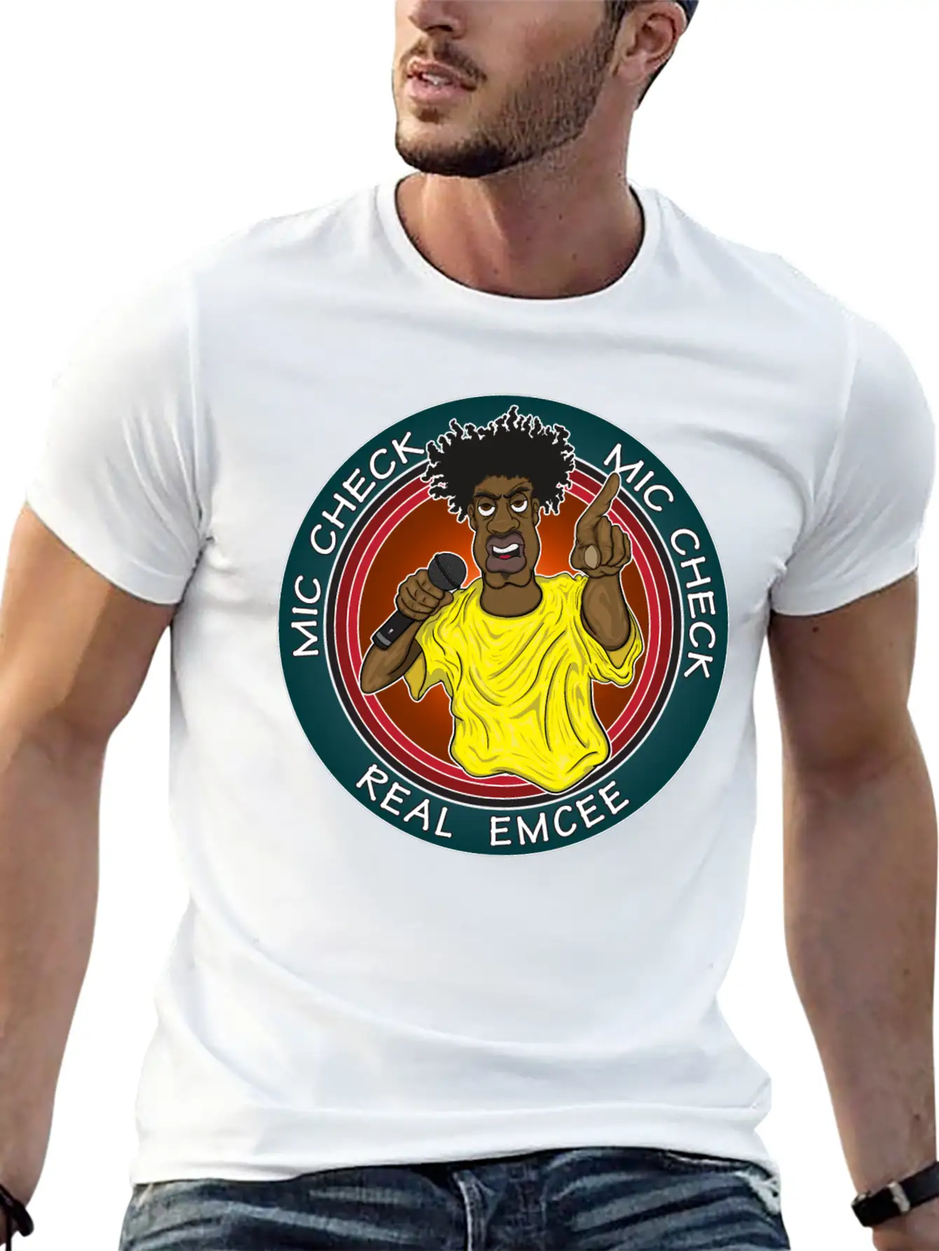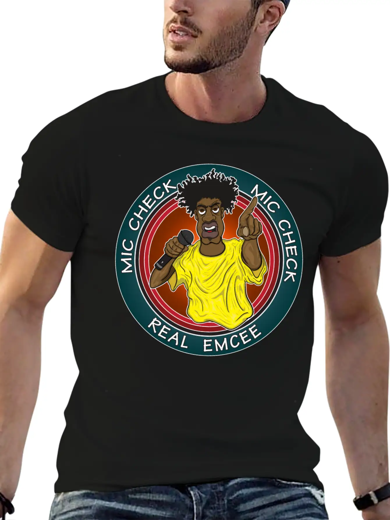 The Real Emcee is the centerpiece of this comfy tee, combining a classic cut with modern design.