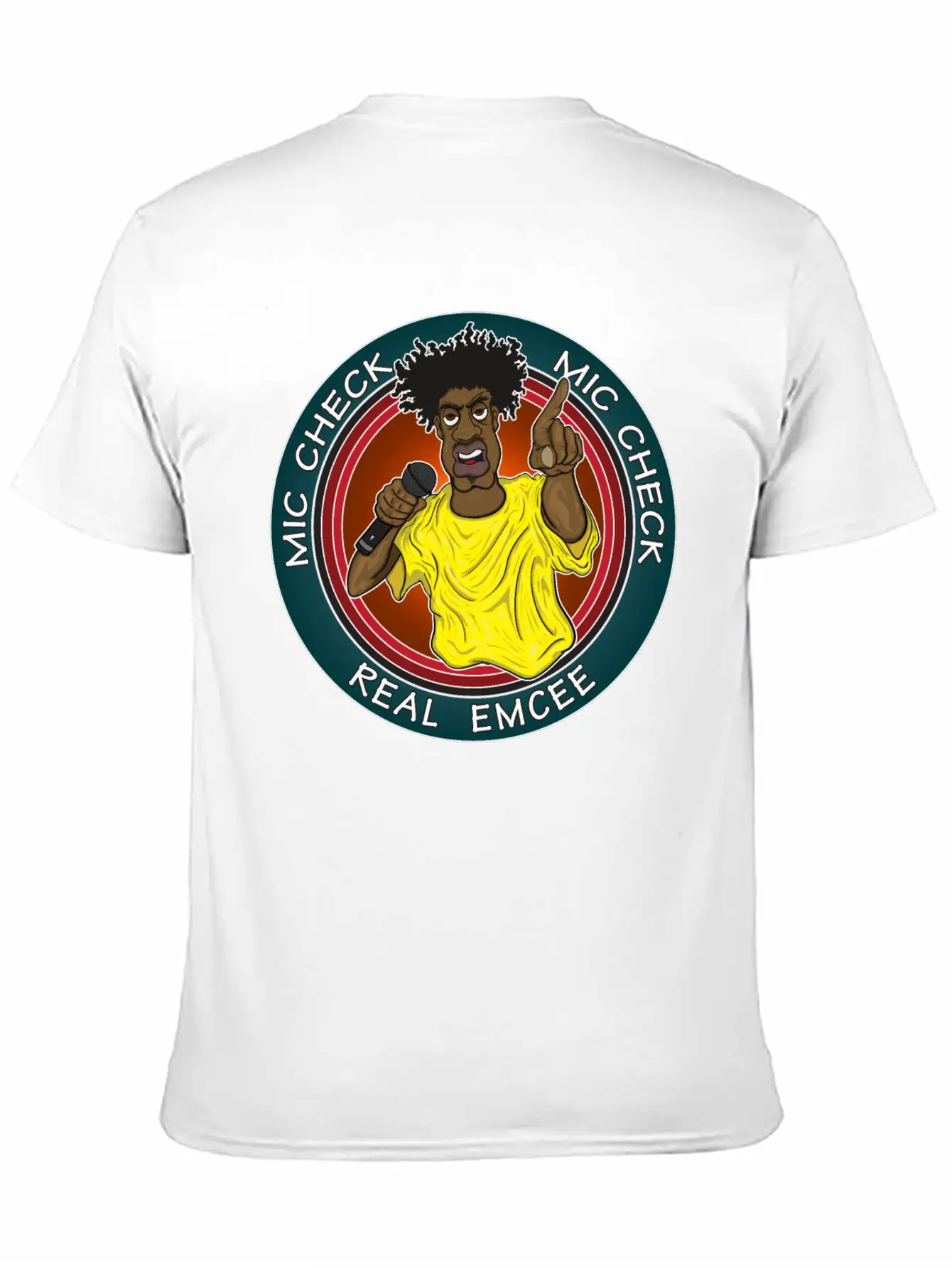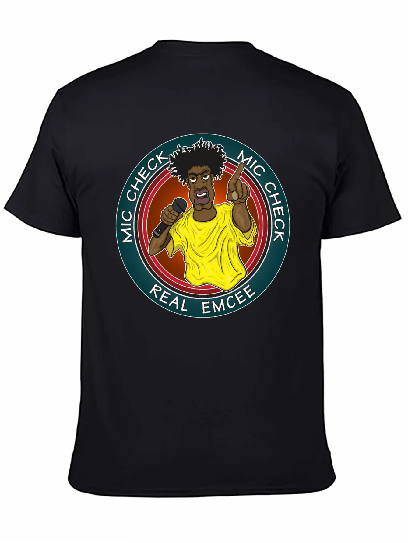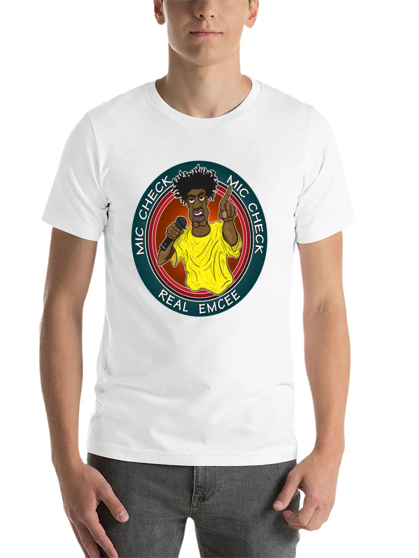 The Real Emcee is the centerpiece of this comfy tee, combining a classic cut with modern design.