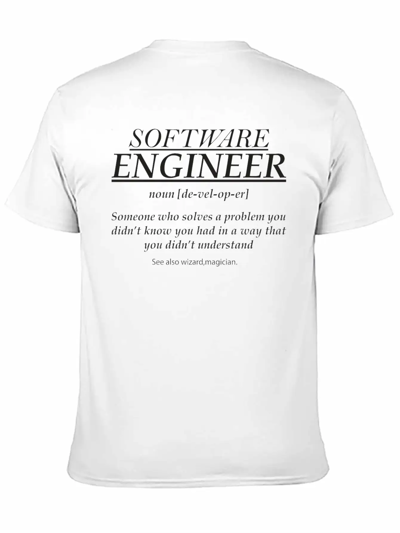 Designed with a bold yet minimal Software Engineer Noun print, this tee brings subtle personality to your wardrobe. Lightweight and comfortable.