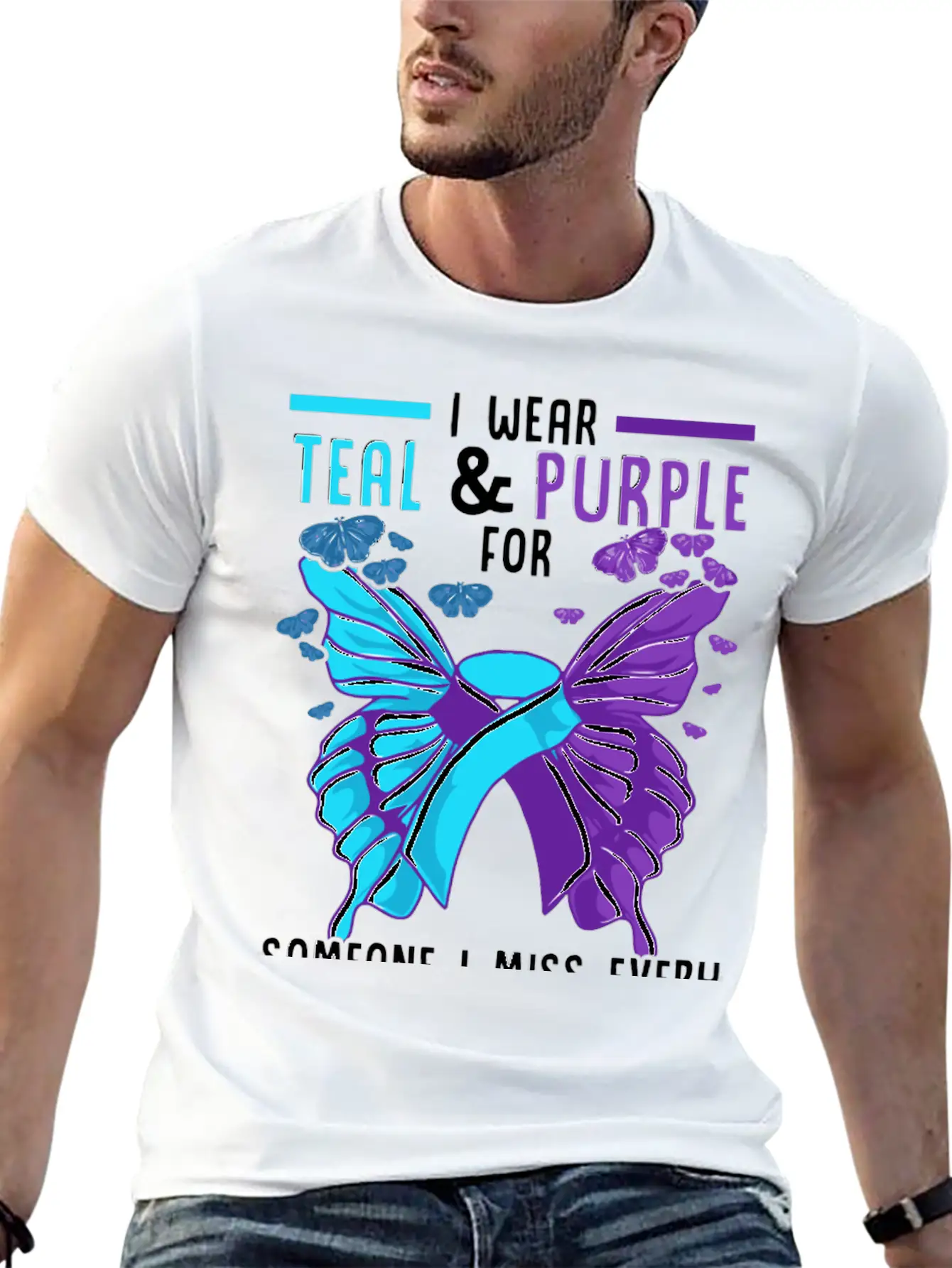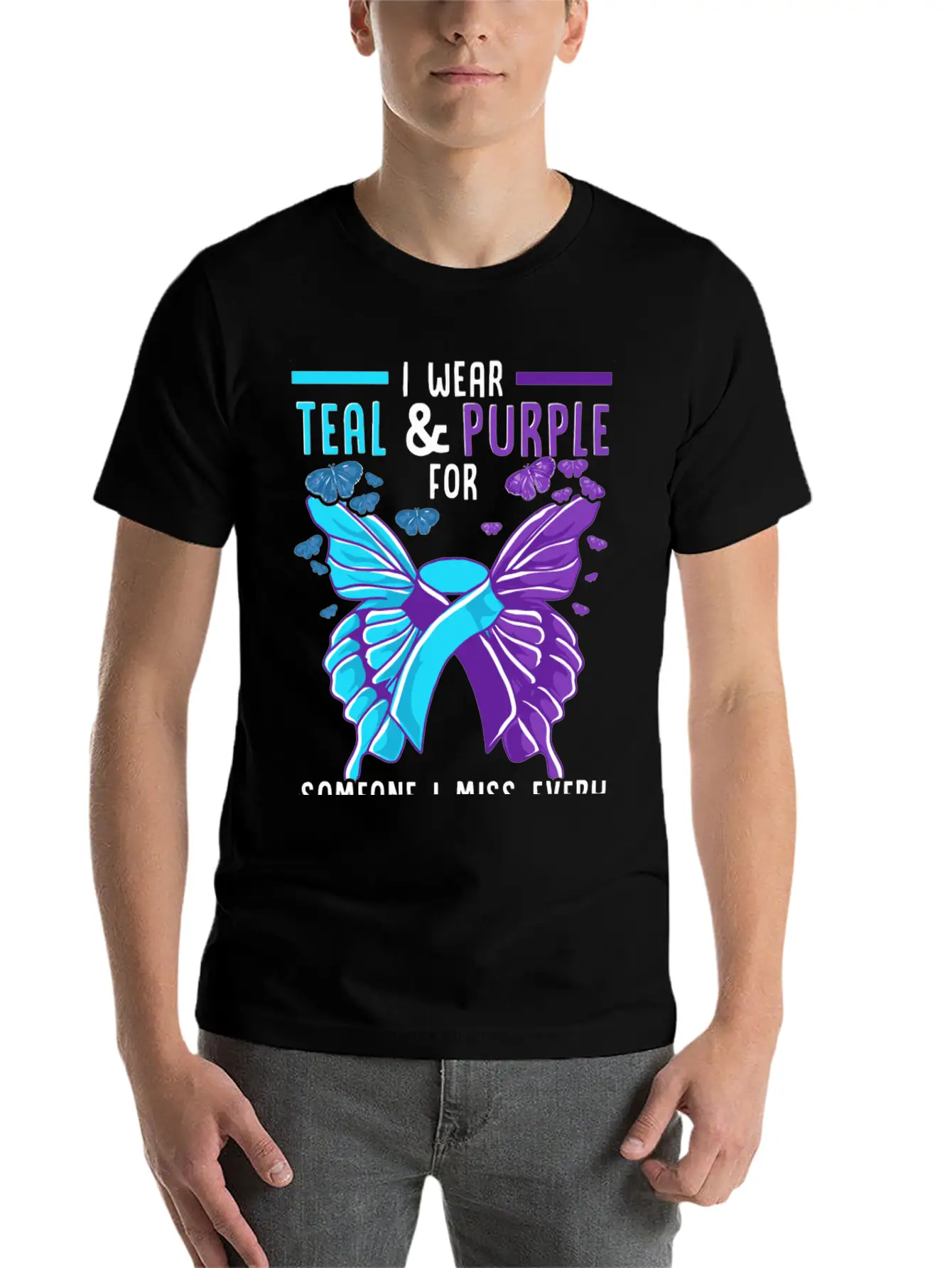 Designed with a bold yet minimal Teal And Purple Ribbon Suicide Prevention Awarenes print, this tee brings subtle personality to your wardrobe. Lightweight and comfortable.